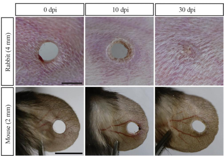 黑色标尺为4 mm兔子(上图)在受伤后30 d内能够再生耳洞,而小鼠(下图)却无法闭合(图片来源:Science)